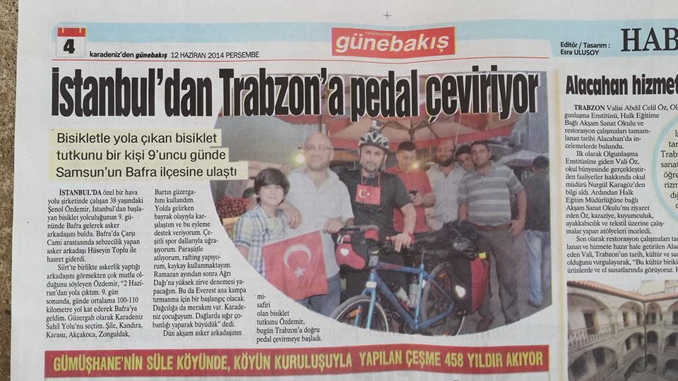 Siirt’te birlikte askerlik yaptığı arkadaşını görmekten çok mutlu olduğunu söyleyen Özdemir, “2 Haziran’dan yola çıktım. 9. gün sonunda, günde ortalama 100-110 kilometre yol kat ederek Bafra’ya geldim. Güzergah olarak Karadeniz Sahil Yolu‘nu seçtim. Şile, Kandıra, Karasu, Akçakoca, Zonguldak, Bartın güzergahını kullandım. Yolda gelirken bayrak olayıyla karşılaştım ve bu eyleme destek veriyorum. Çeşitli spor dallarıyla uğraşıyorum. Paraşütle atlıyorum, rafting yapıyorum, kaykay kullanmaktayım. Ramazan ayından sonra Ağrı Dağı‘na yüksek zirve denemesi yapacağım. Bu da Everest ana kampa tırmanma için bir başlangıç olacak. Dağcılığa da merakım var. Karadeniz çocuğuyum. Dağlarda sığır çobanlığı yaparak büyüdük” dedi.